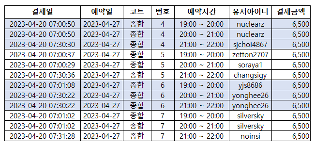 아래는 27일 4,5,6,7번 예약현황 입니다.