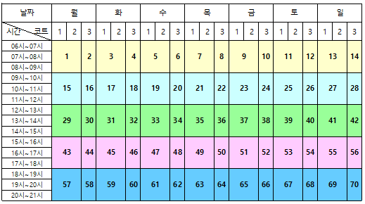 레슨 코트를 제외하고 코트 사용시간을 첨부의 표와 같이 나누어 본다면 70개의 시간대(일종의 모임)가 나올 수 있습니다. 호계(6면)와 종합(7면)의 경우를 고려하면 더 많은 시간대가 나올 수 있습니다.