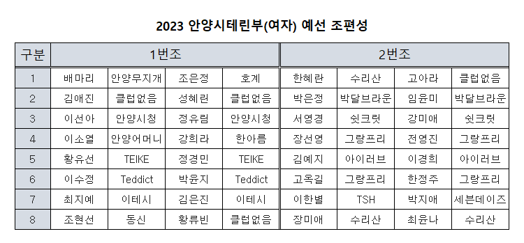 2023 안양시 테린이대회 여자부는 자유공원 테니스장에서 예선 및 본선이 진행되오니 9시까지 출전신고 해주시기 바랍니다.