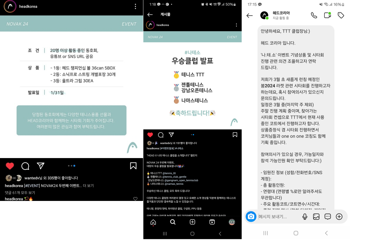 위 와 같이 헤드에서 “나의 테니스 팀을 소개합니다” 라는 이벤트를 진행하였고 저희 TTT가 1위를 차지하게 되어서