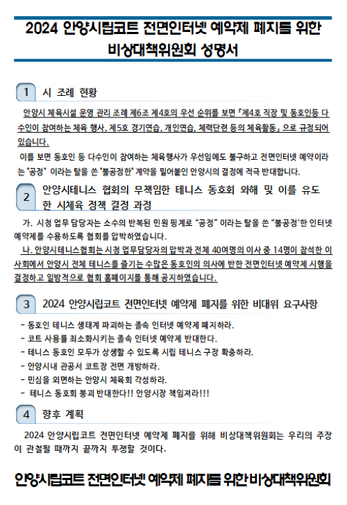 결의된 운영방안은 안양시 체육과와 협의하여 9월1일부터 전면 인터넷에약으로 시행하기로 결정되었습니다.