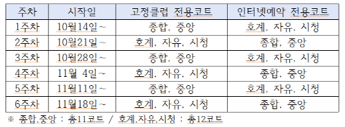 1. 기존 월 1회 평일 야간/토,일 로테이션으로 인터넷예약을 운영하였으나, 월 2회 평일 주,야간/토,일 주,야간 로테이션으로 고정클럽 2주/인터넷예약 2주로 운영하여 고정클럽 대 인터넷예약 비율을 5:5로 운영함.