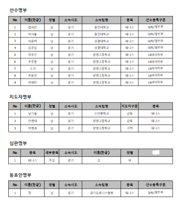 선거규약에 의거 대한체육회를 통하여 안양 주소지 경기인 명부를 대한테니스협회 전산시스템에 요청하여 18세이하를 제외한 총 14명의 명단을 수신했습니다. 이중 3명은 참여의사가 없거나 연락이 불가하여 최종 11명이 경기인 선거인에 선정되었습니다.