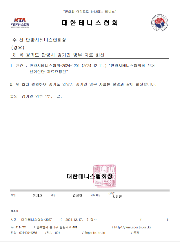 위 선정 절차는 선거운영위원회에서 대한테니스협회 전산에 등록된 경기인 명단을 근거로 선거규약 절차에 따라 객관적으로 선정된 것으로 누군가 임의로 뽑은 명단이 아님을 알려 드리며 안양시체육회에 절차와 선정 방식을 확인 하시면 됩니다.