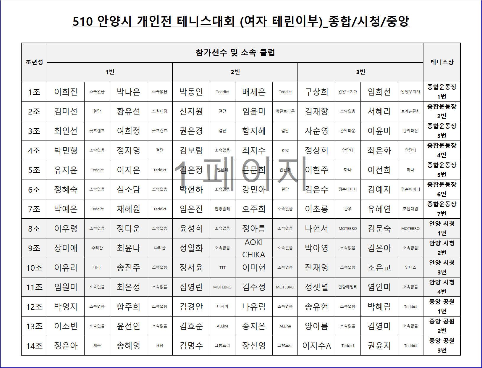 510 안양시 개인전 [여자 테린이부] 대진표