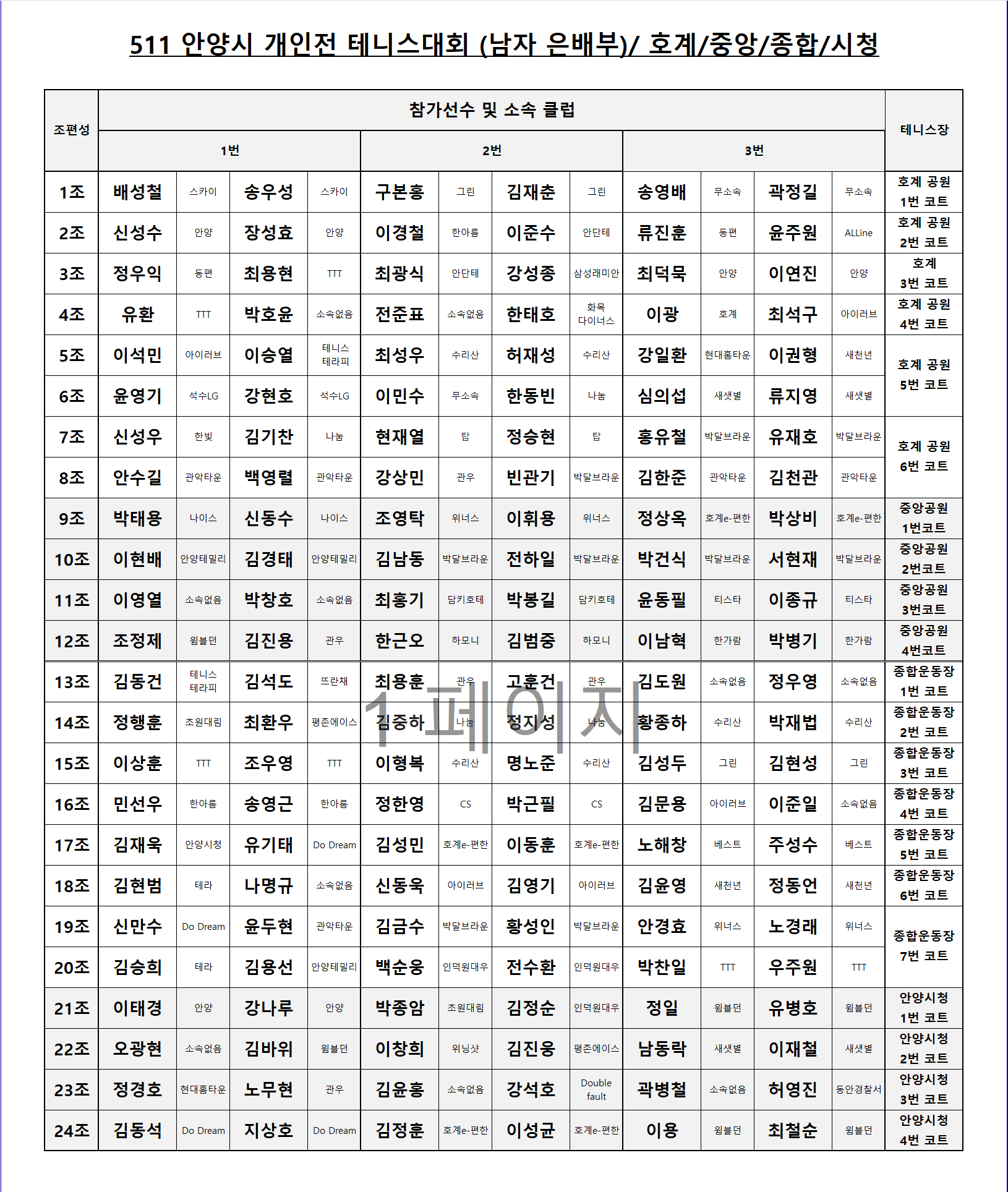 511 안양시 개인전 [남자 은배부 대진표] 안내