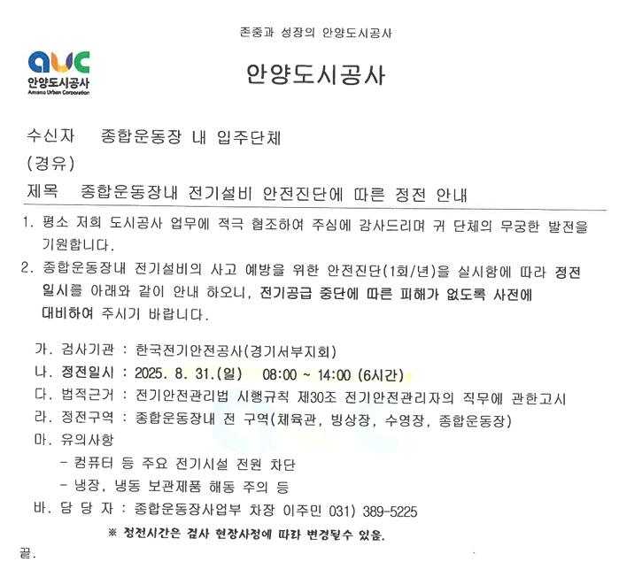 종합운동장 테니스장 정전 안내 (8월31일 8:00-14:00)