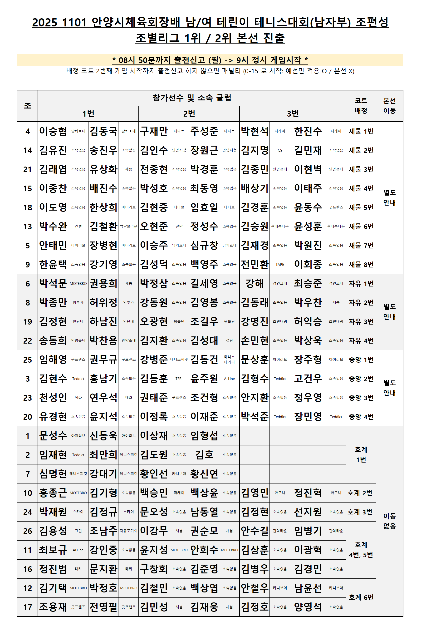 11/1(토) 남자부 예선 조편성 입니다.