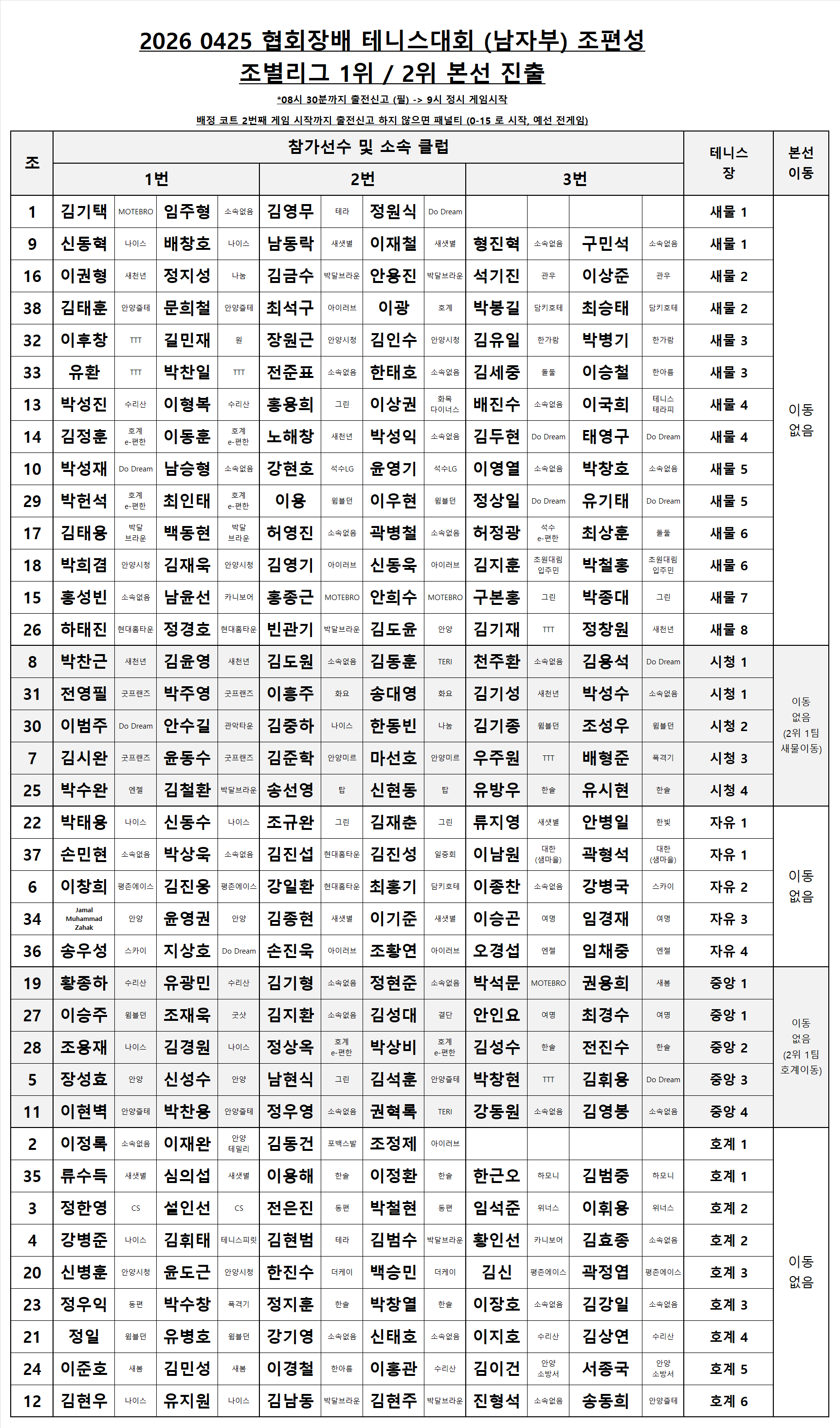 425 협회장배 개인전 테니스 대회 남자부 대진표